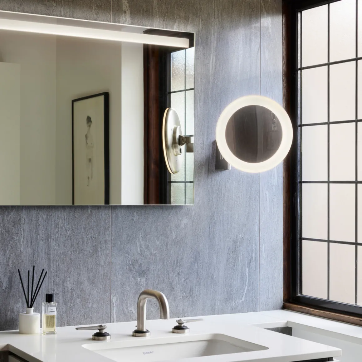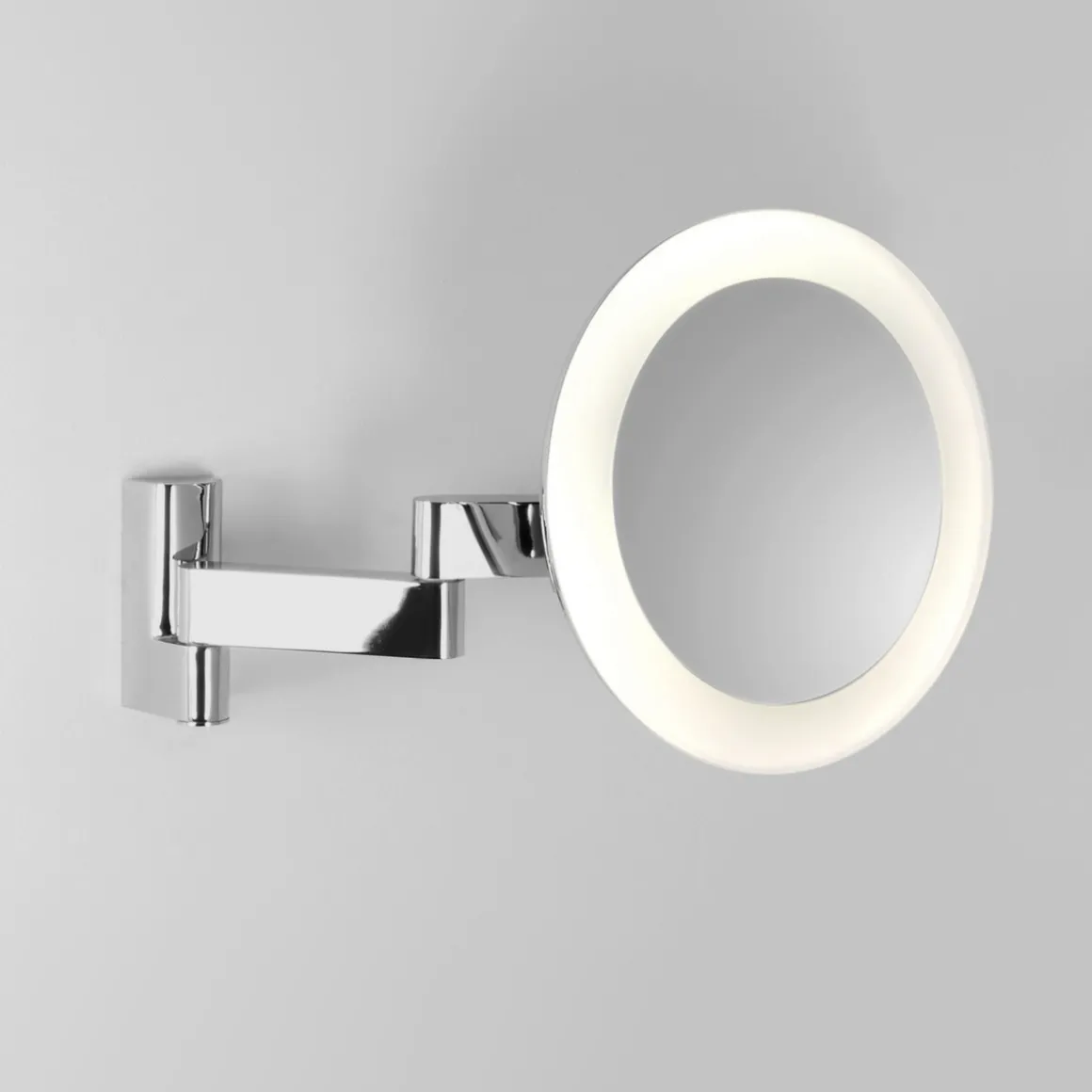 Nimi-rundt speil med lys i polert krom med sandblåst detaljer.