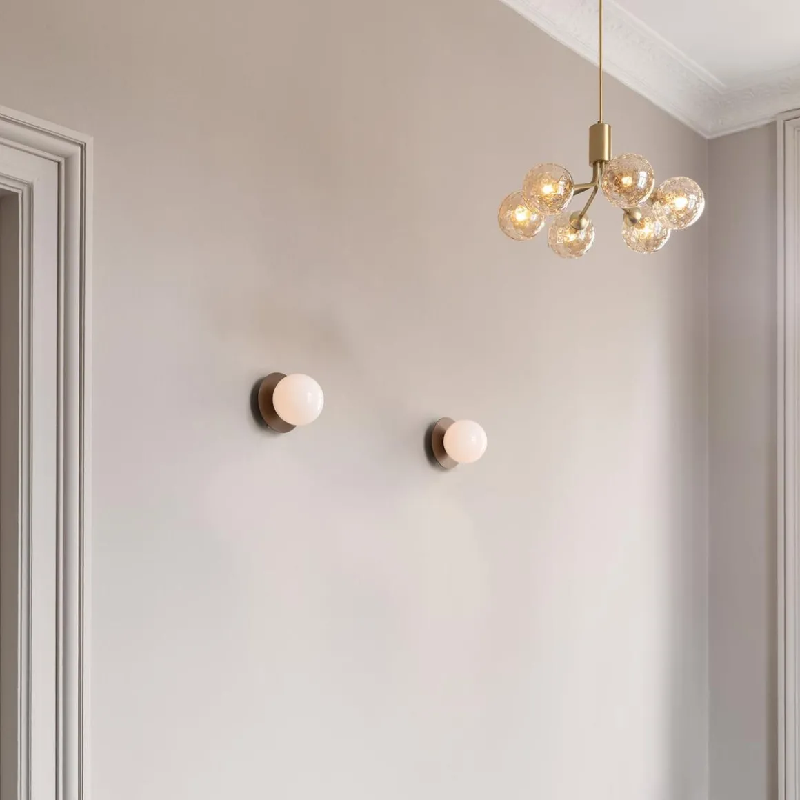 Med inspirasjon fra blomster, bretter Apiales 6 ut de børstede messingmetallstilkene til opalhvite glasskuler, og tilbyr et mykt og behagelig uttrykk til rom med begrenset plass.