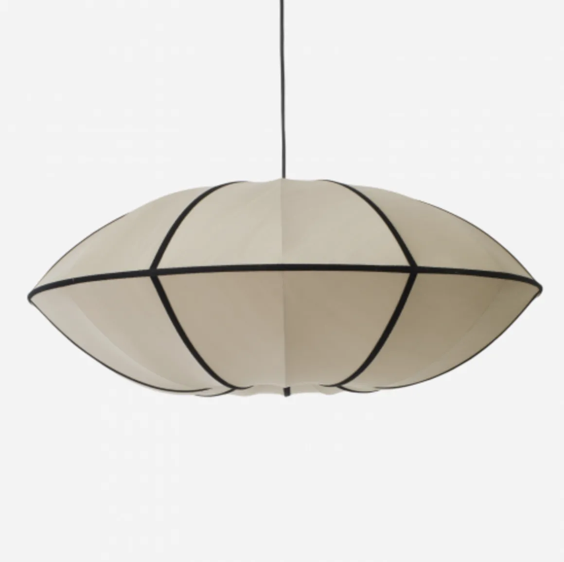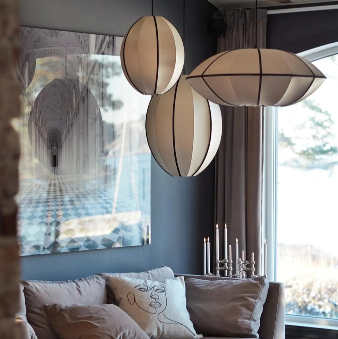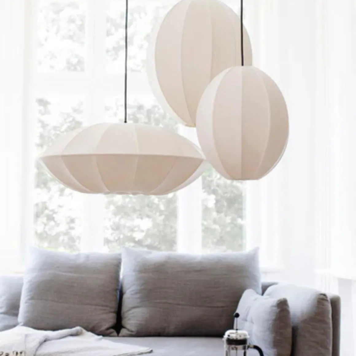 Oi Soi Oi lager noen av de vakreste taklampene vi har sett. Disse silkeskjermen kommer i forskjellige størrelser og fasonger. De henger fint alene og er fine i gruppe av flere.