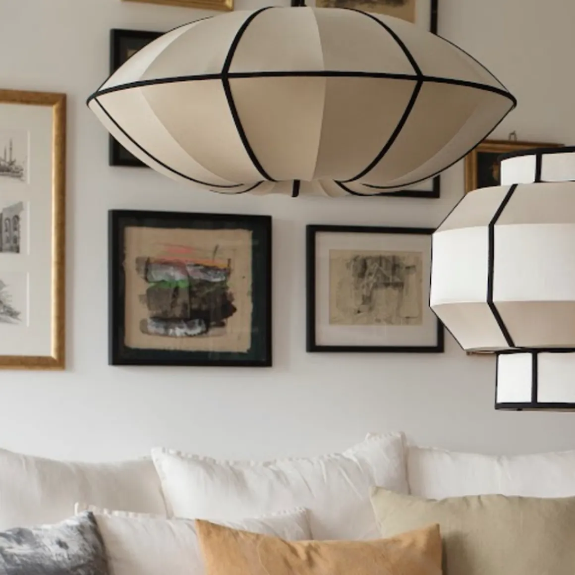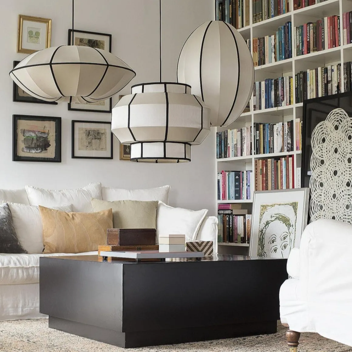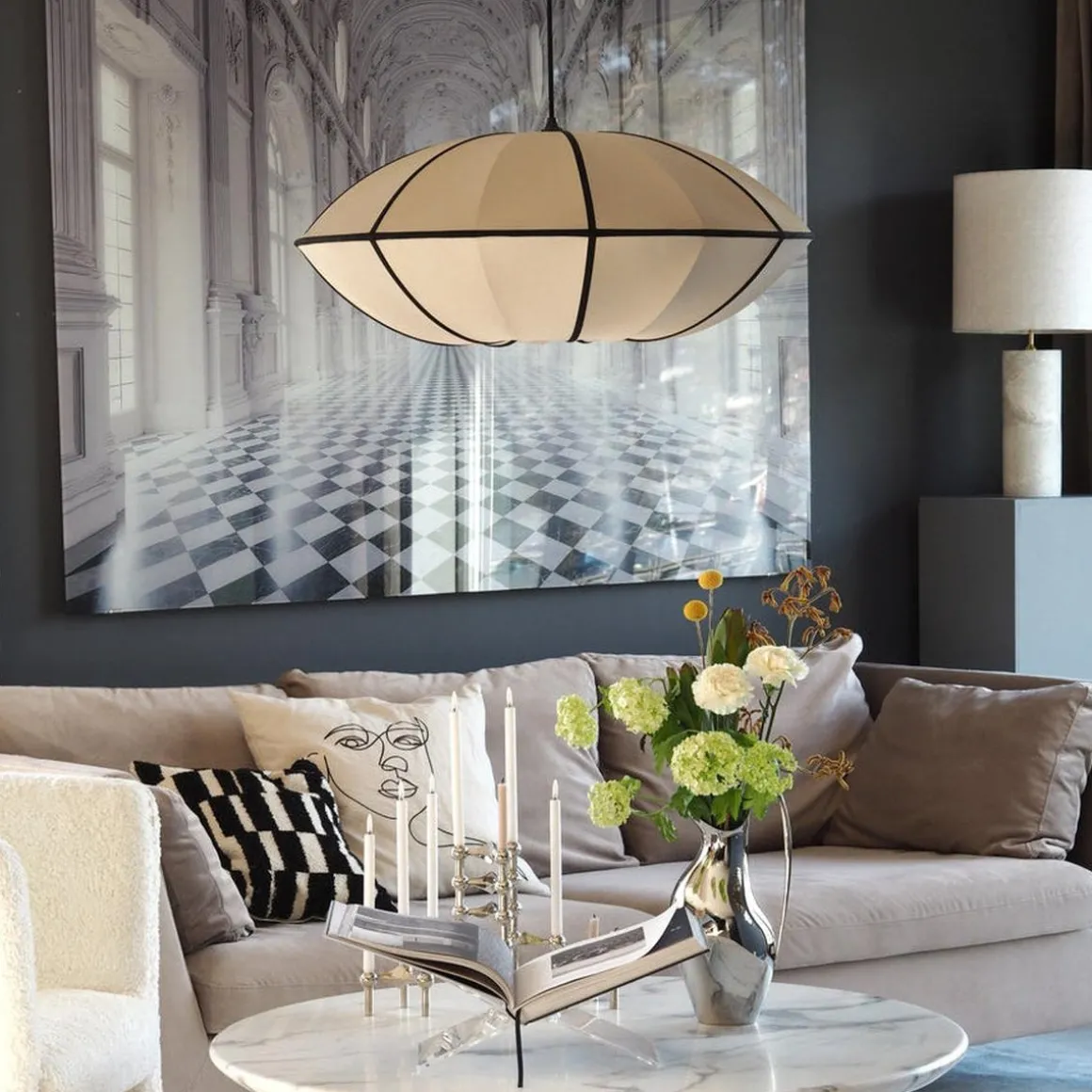 Oi Soi Oi lager noen av de vakreste taklampene vi har sett. Disse silkeskjermen kommer i forskjellige størrelser og fasonger. De henger fint alene og er fine i gruppe av flere.