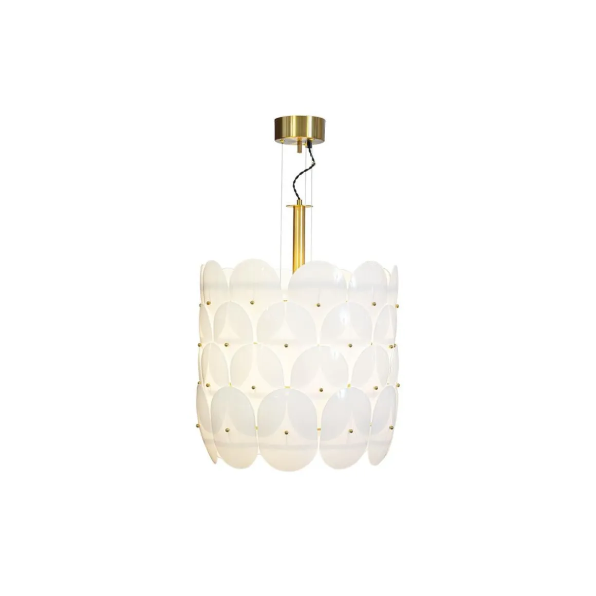 Lampeskjermen i opalhvitt glass sprer et mykt og behagelig lys som skaper en varm og innbydende atmosfære. De elegante messingdetaljene tilfører en følelse av sofistikert, mens de tvinnede tekstilkablene i harmoniske fargetoner gjør lampen både funksjonell og estetisk tiltalende.