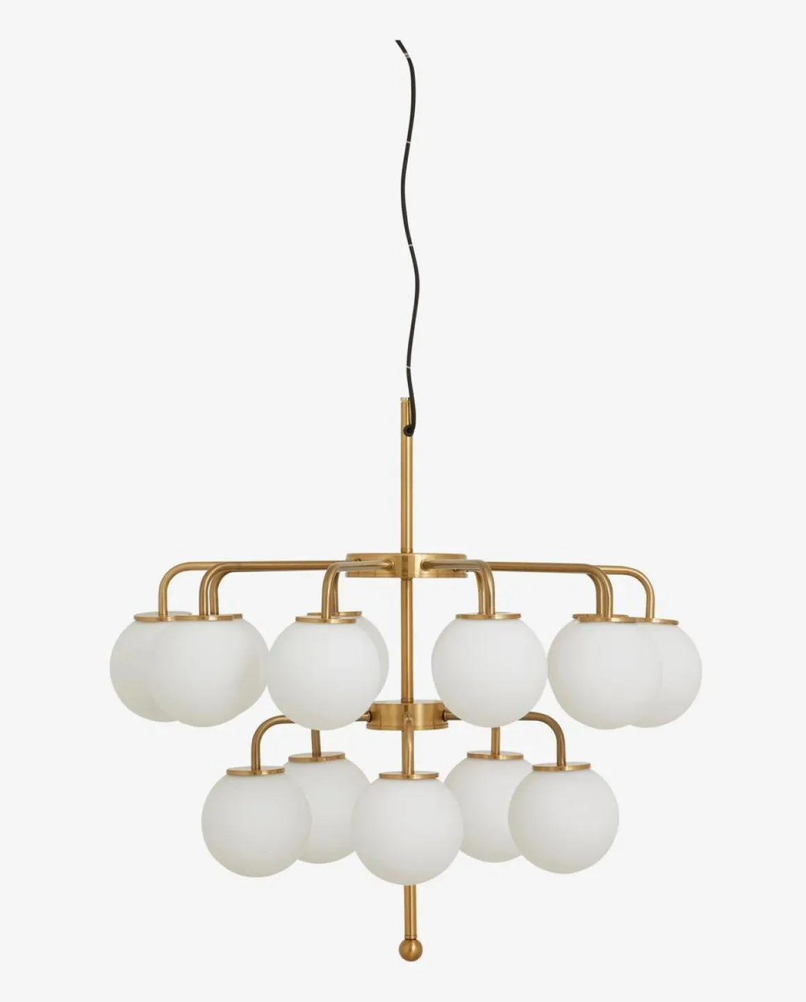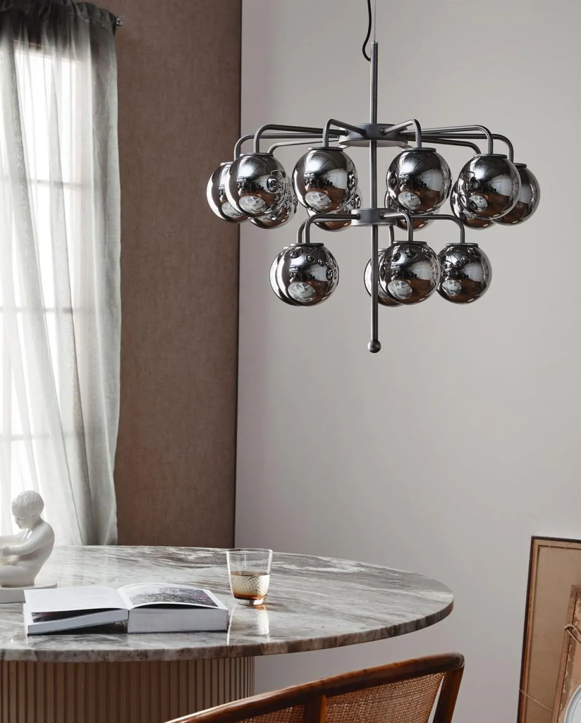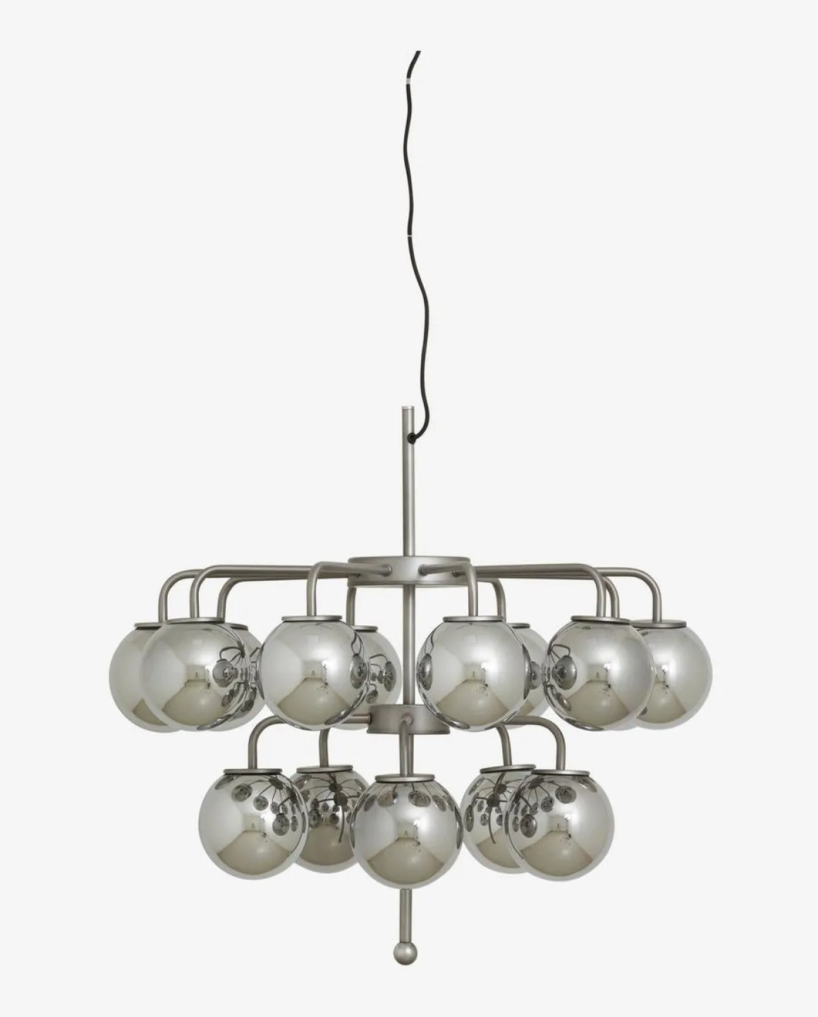 PALMA lysekrone laget av matt sølvmetall. Lampen har 15 sokler med glasskuler. Glasskulene har en metallisk finish som gjør at lyskilden dimmes.