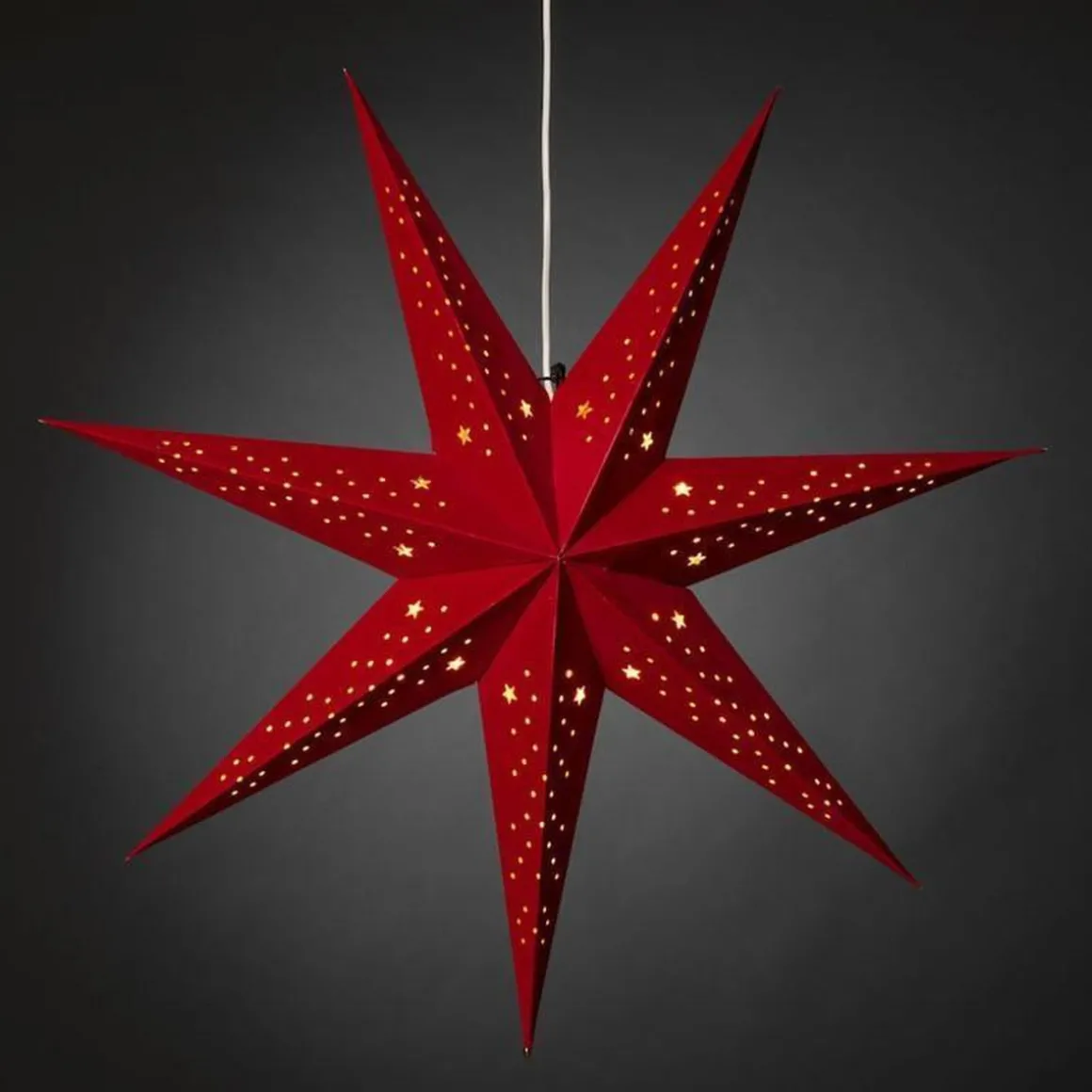 Pappstjerne 78 cm rød fløyel med gull innside. 7 armet. Inkludert oppheng. E14 lampeholder. Hvit kabel.