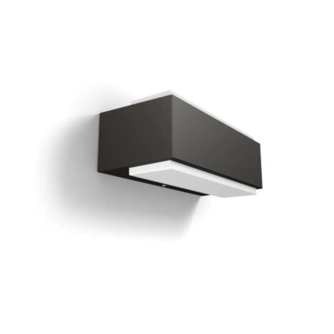 Denne Philips Stratosphere LED-utendørsvegglampen i antrasittgrått er formstøpt i slitesterk aluminium. Designet gir en toveis lyseffekt på veggen din med rikelig med diffust varmhvitt lys