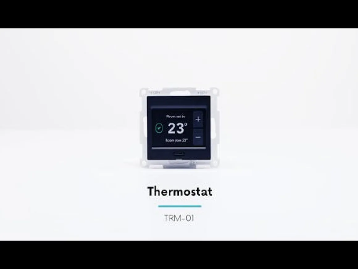TRM-01 er en termostat for elektrisk gulvvarme med en berøringsskjerm for å styre og vise temperatur og varmemodus. Den kan tåle en last på inntil 16A, har innebygd romføler og medfølgende gulvføler. Den kan også brukes med eksisterende gulvføler eller som regulator (PWM). TRM-01 kan automatiseres for energisparing, gjennom f.eks. dag- og nattesenking. Med en Gateway (GWY-01, ikke inkludert) kan produktet fjernstyres.