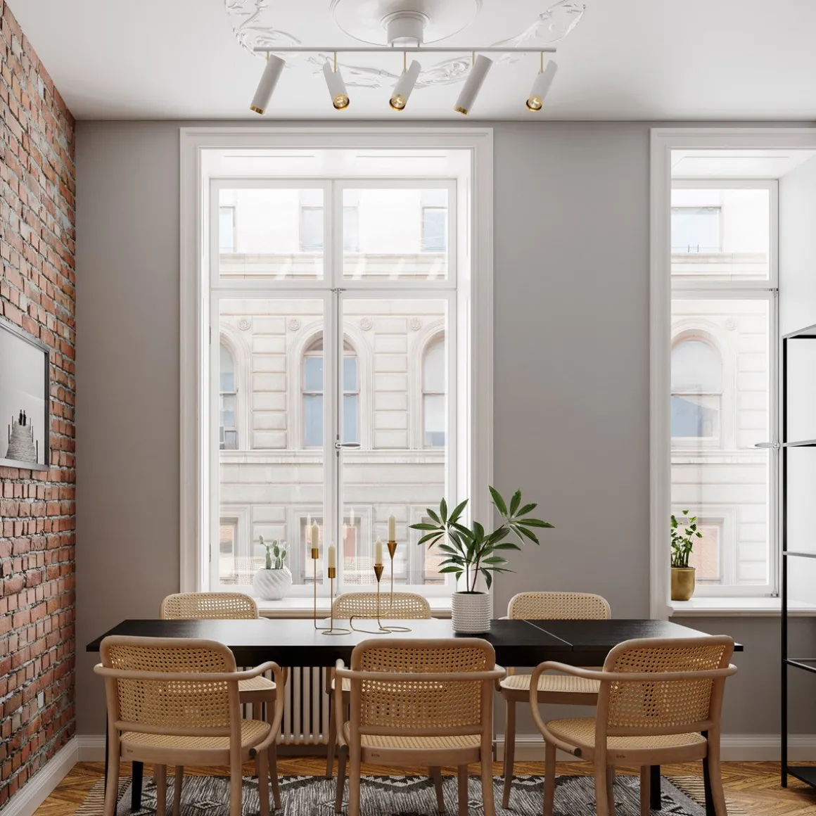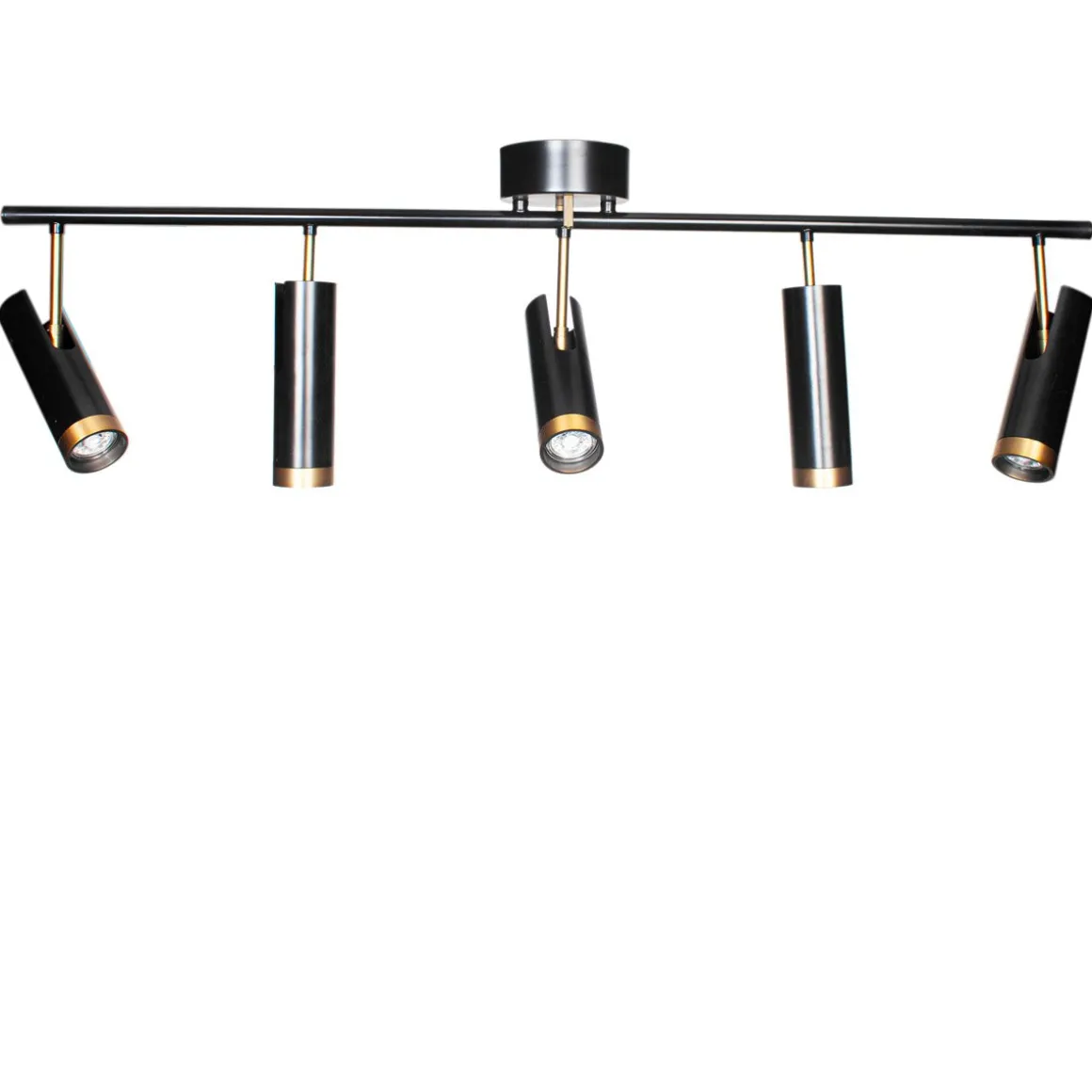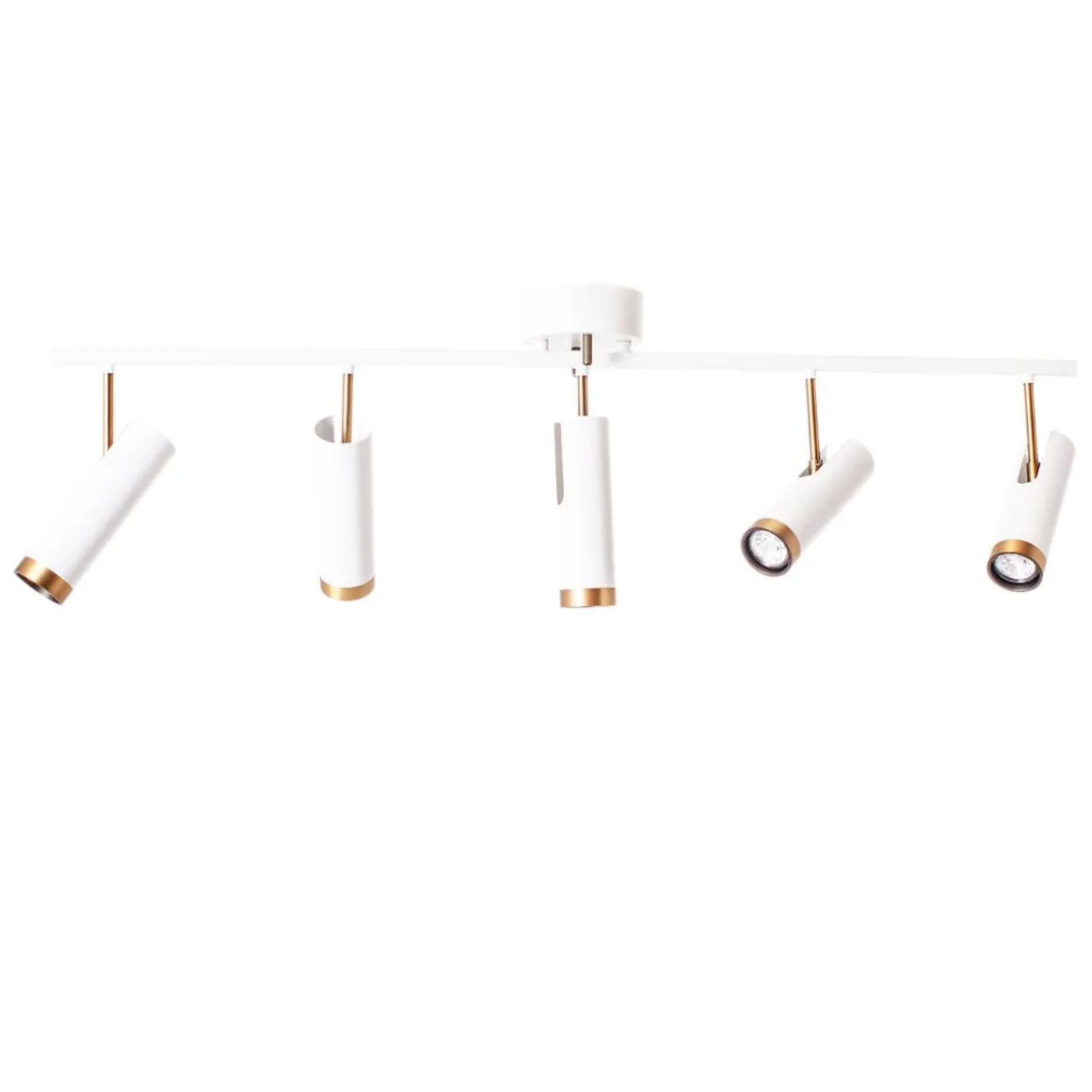 Fyll rommet med lys fra gulv til tak – Puls takskinne med fem spoter kan justeres i den retningen du ønsker. Skinnens design er enkel, men med en stor eleganse i moderne utførelse. Skinnen fås i matt hvit farge med fester av gullfarget metall som også går igjen på den ytterste delen av lampehodet. Festet er lett å montere opp i taket. La lampen sitte i taket i kjøkkenet, i entreen eller la den ta plass midt i stuetaket. Skinnen er 35 cm høy, 13 cm dyp og 110 cm bred.