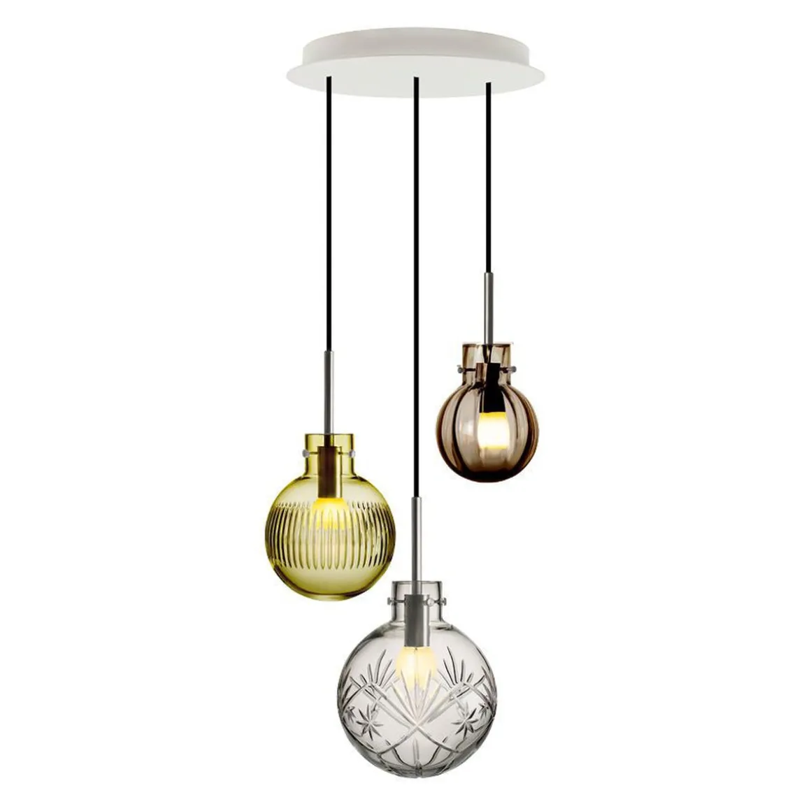 I denne kombinasjonen er det brukt følgende krystallkuler: 1 stk 12 cm Optik kakao, 1 stk 16 cm Skjær Oliven, 1 stk 20 cm Finn klar, Hvit takbaldakin 34 cm i diameter.