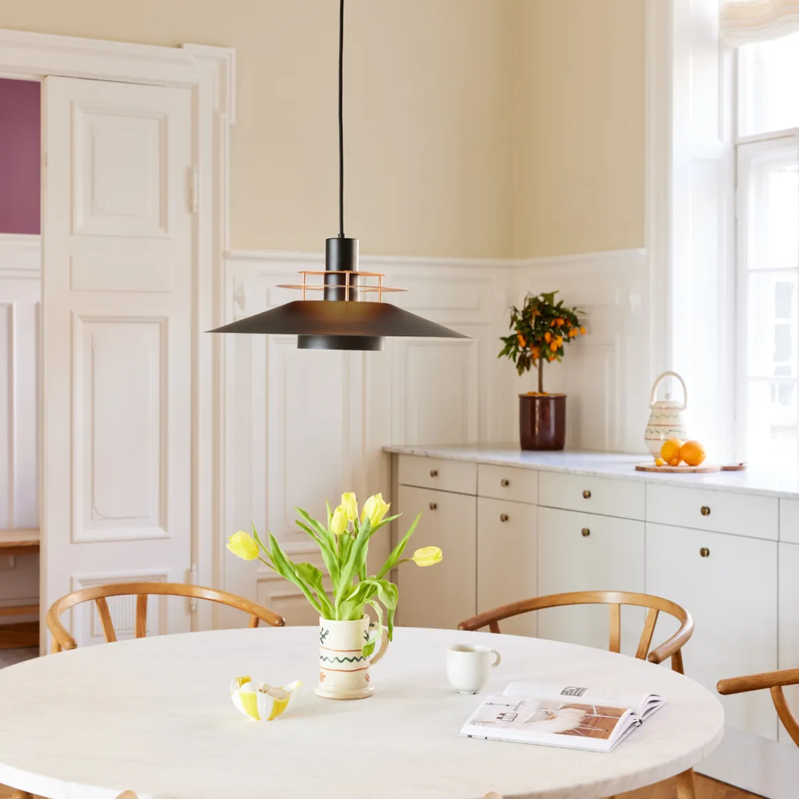 Rivoli pendel Ø40 cm i sort med krom topp og med hvitlakkert innerskjerm, som gir perfekt refleksjon av lyset og sørger for perfekt lys i rommet.