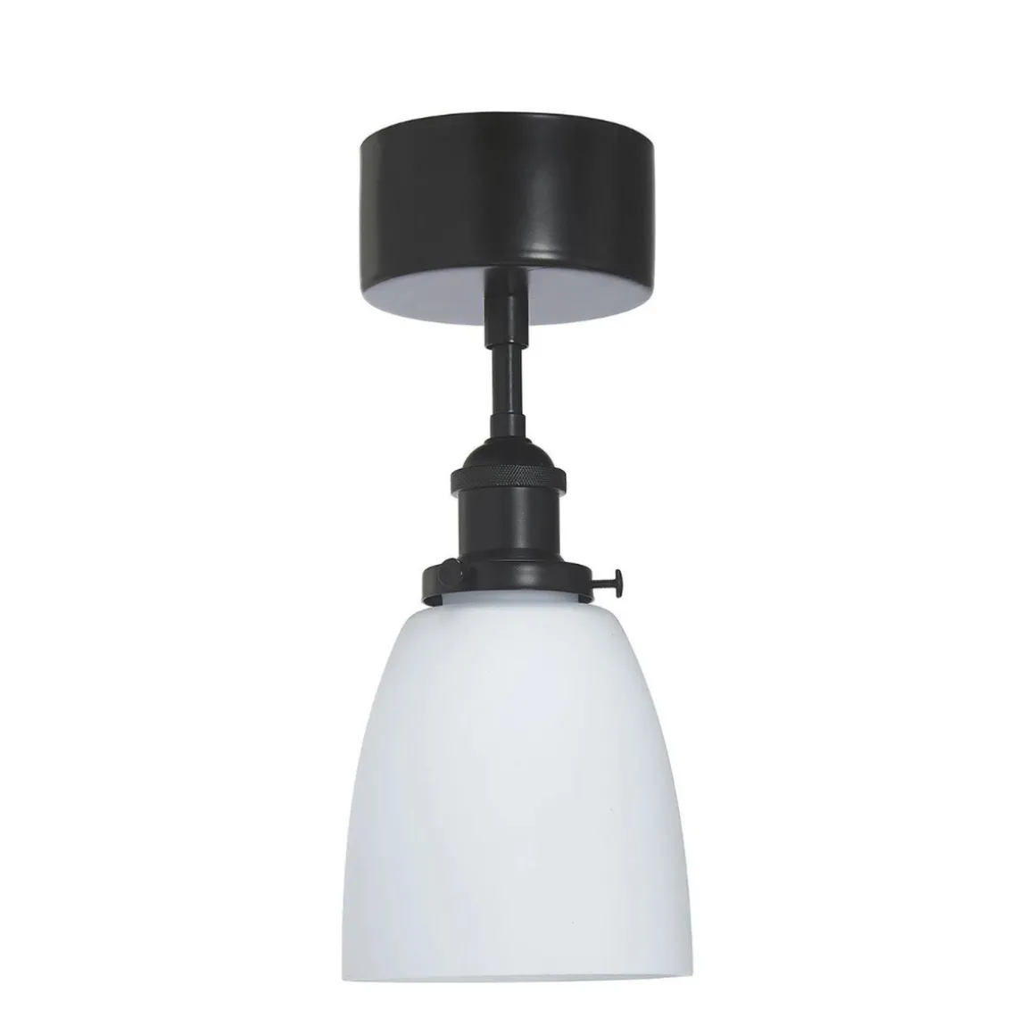 Taklampe med krokoppheng i klassisk design og chassis i opalt glass og metall i matt sort overflate. Siden glassskjermen er håndlaget, kan det forekomme luftbobler i glasset og noen ujevnheter i glasstykkelsen over glassoverflaten.