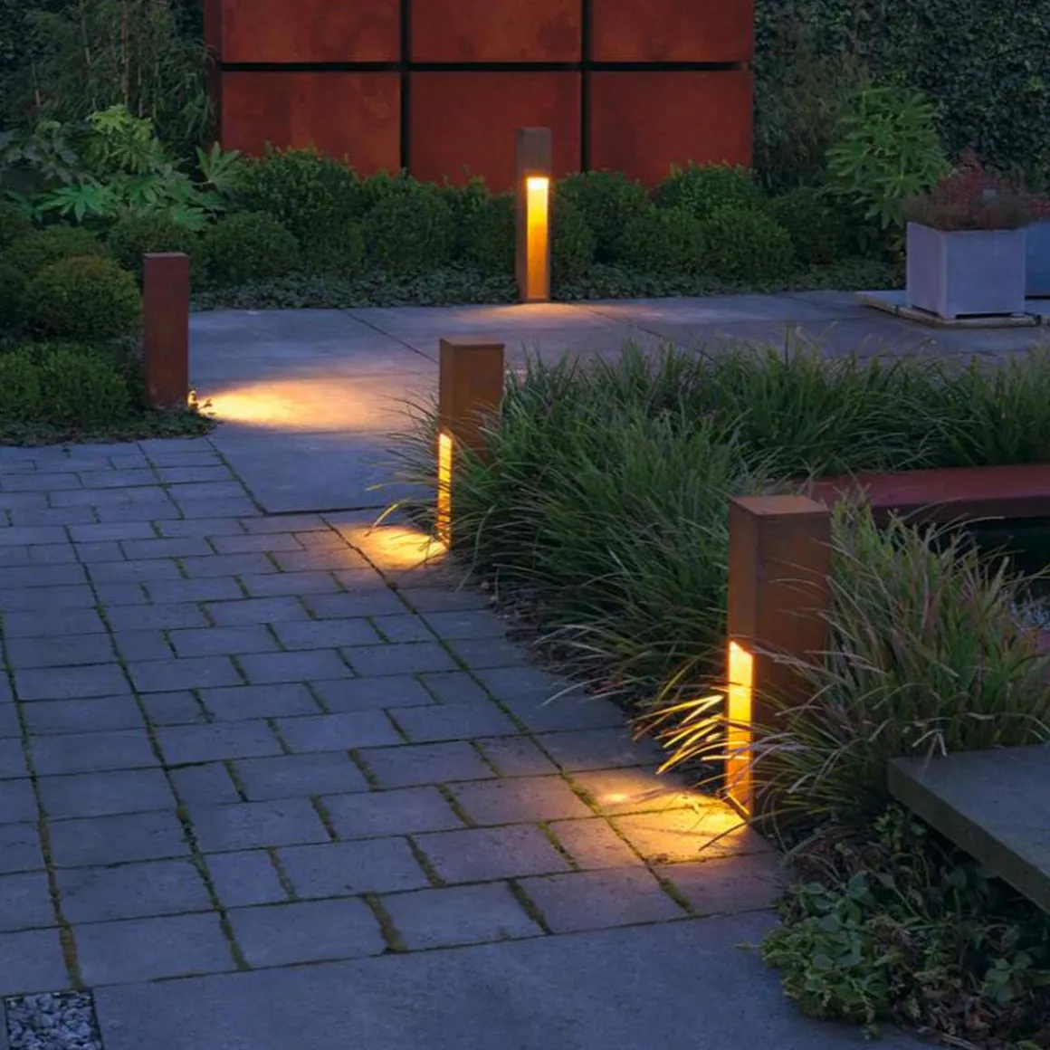 Pullerter i RUSTY® SLOT-serien stråler indirekte og overbeviser med sin uvanlige rust-look. Dette oppnås med en spesiell kjemisk behandling av FeCSi-stålet som er brukt i armaturet. Dette gjør armaturene unike og helt spesielle i enhver installasjon. Med kapslingsklasse IP44 er den egnet til utendørs bruk. Et jordspyd samt en koblingsboks for sikker elektrisk tilkobling i den kvadratiske armaturfoten finnes som ekstrautstyr.