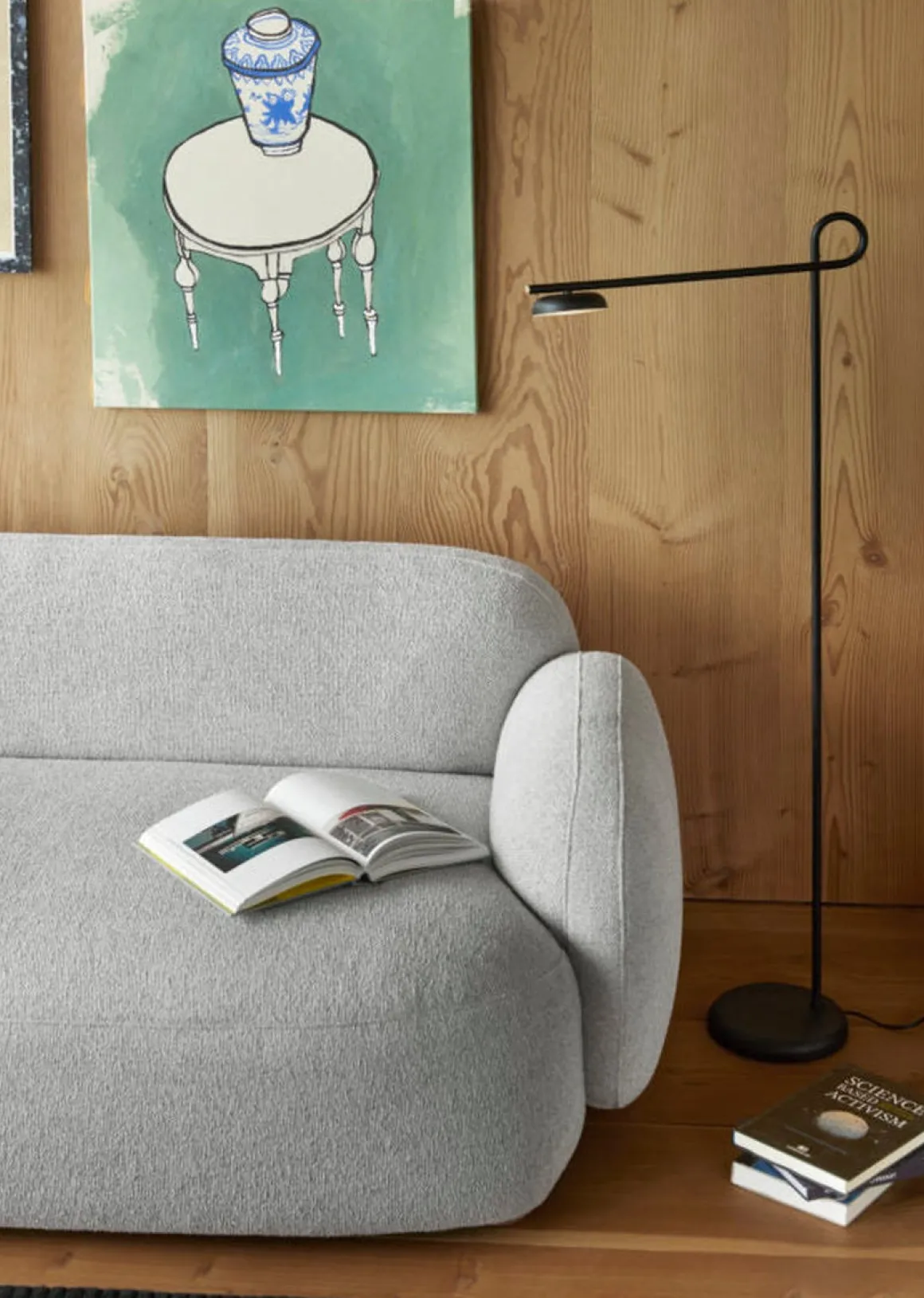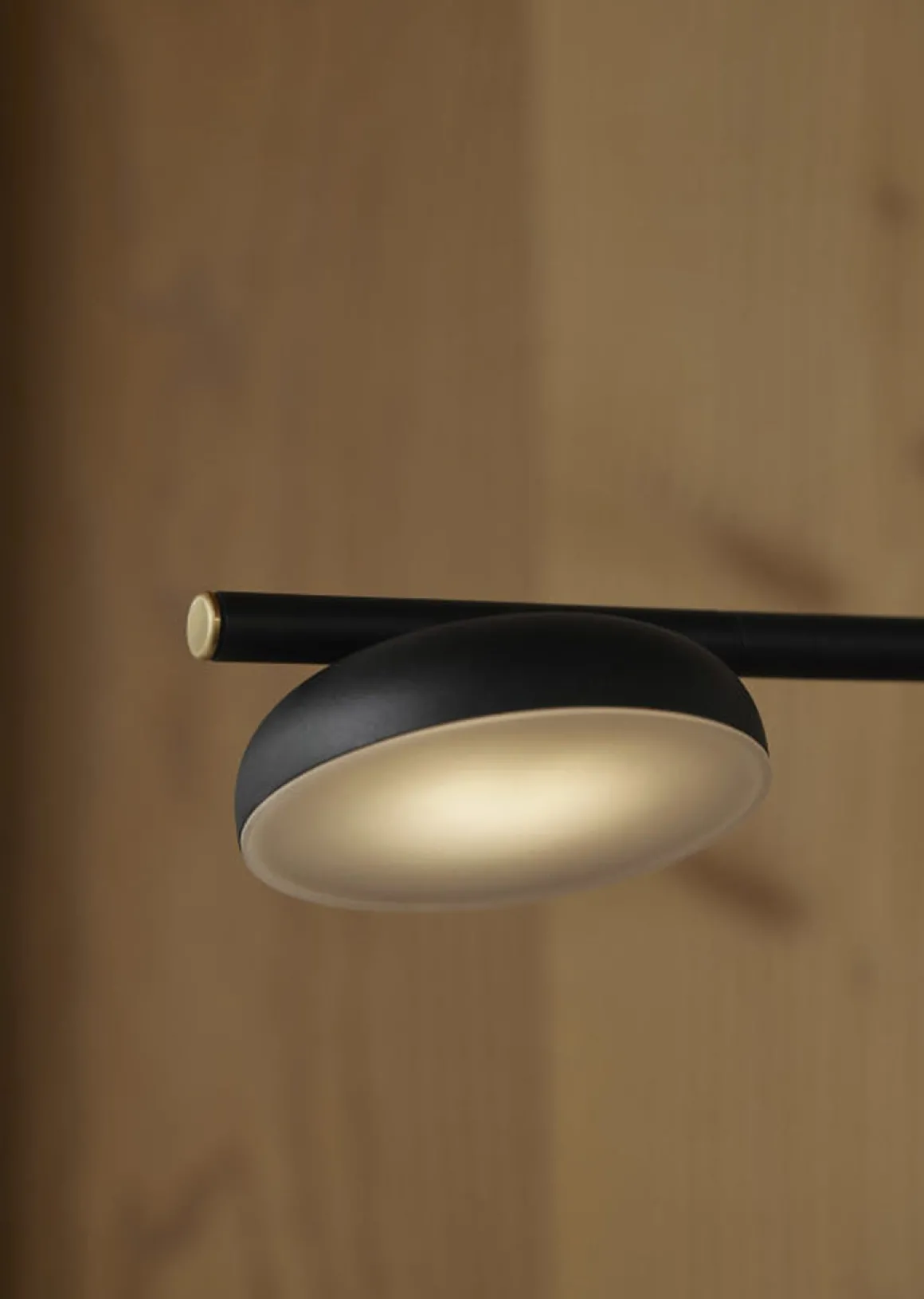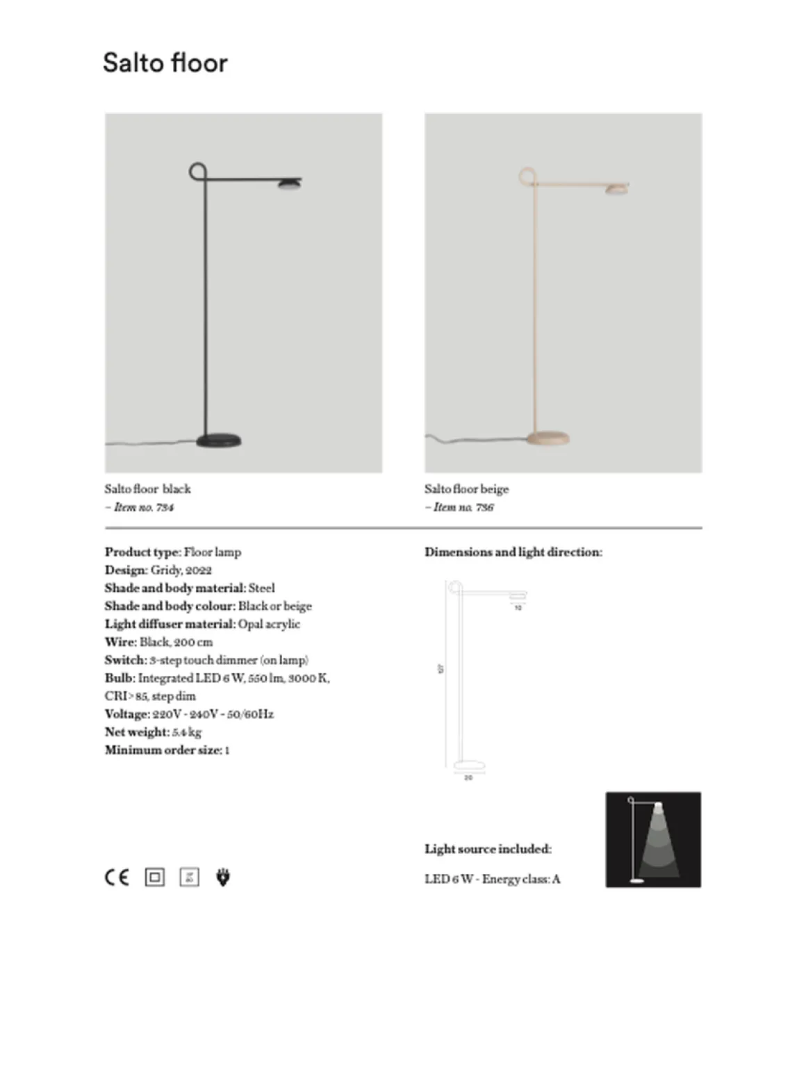 Salto går visuelt fra den vertikale foten til den horisontale armen i en jevn og sømløs bevegelse, og er tilgjengelig som gulvlampe og bordlampe og kommer i en matt svart eller beige finish. Den har også en diskret 3-trinns berøringsdimmer i messing foran på det integrerte LED-lyset, samt en justerbar skjerm og rotasjonsbase som gjør den like praktisk som den er vakker.