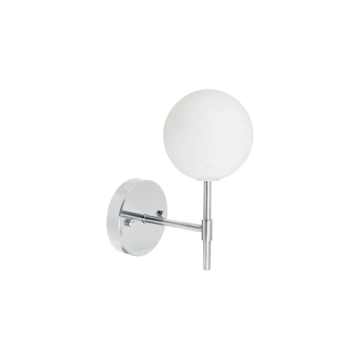Vegglampe i minimalistisk design med opalglass og metallramme i rom. Den er fuktsikker i IP23-klassifisering og passer godt i baderomsmiljøer.
