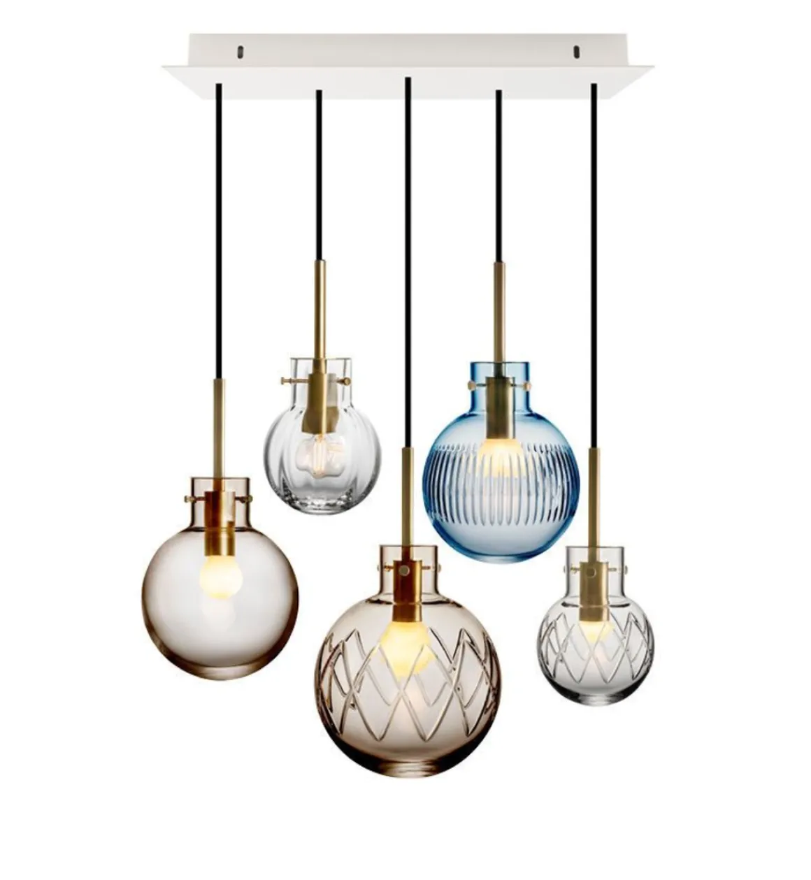 I denne kombinasjonen er det brukt følgende krystallkuler: Kryss kakao 200 mm, Skjær Stålblå 160mm, Glatt Kakao 160mm, Kryss Klar 120mm og Optikk Klar 120 mm. Messingoppheng til 3 krystallkuler med sort tekstiltrukket kabel på 3 meter. Hvit rektangulær takbaldakin 500mm x 200mm