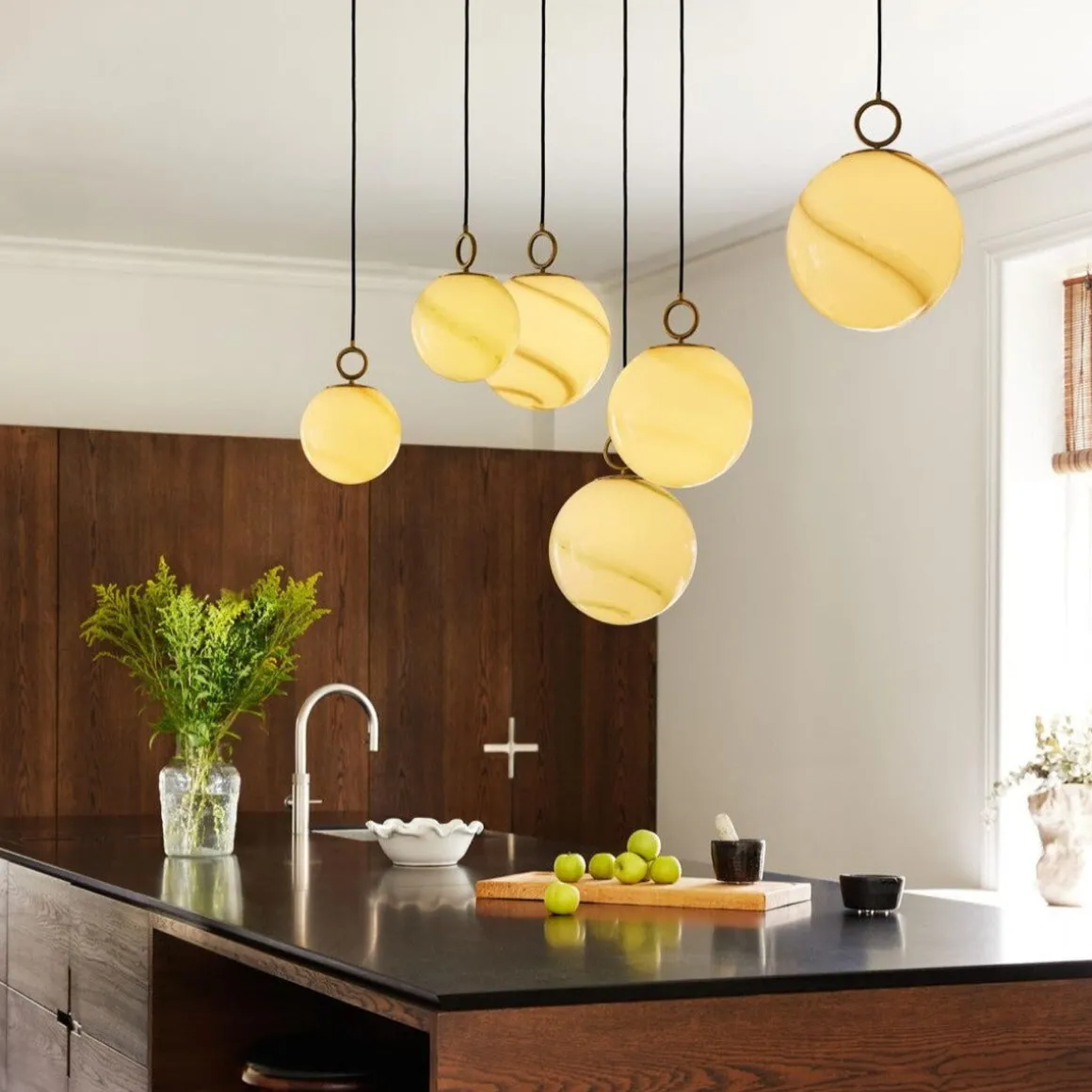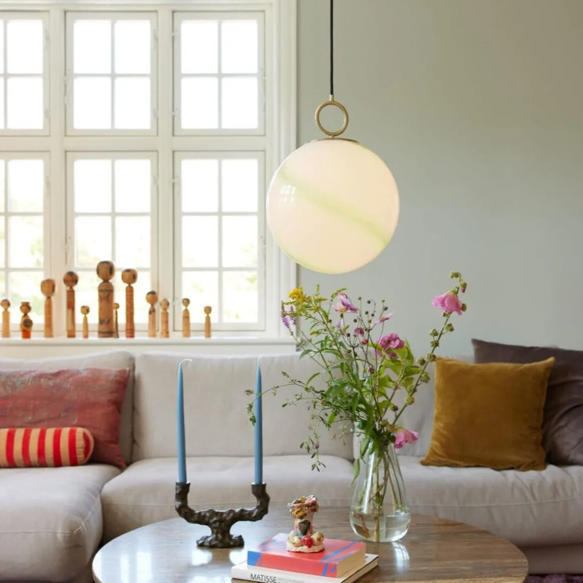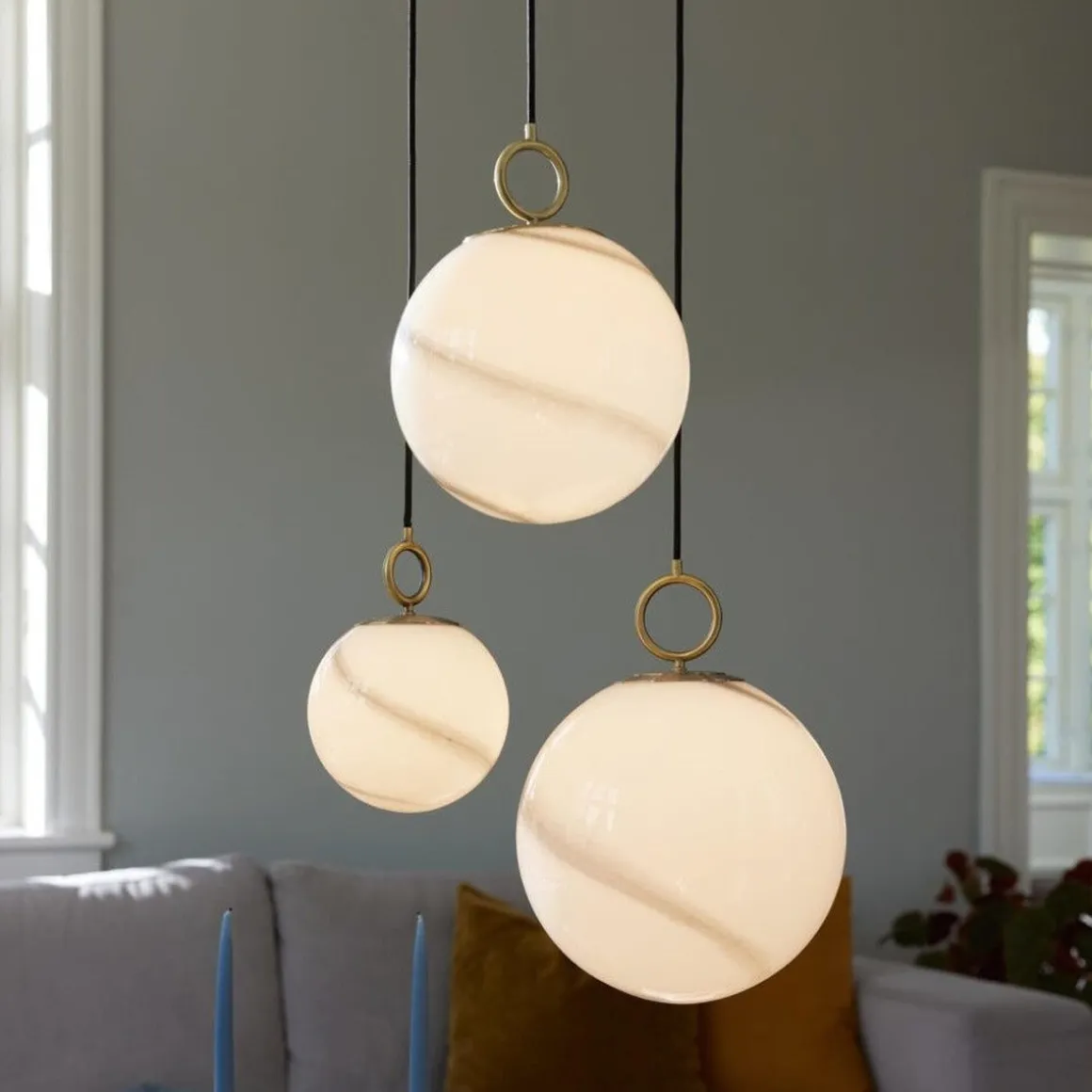 Estetisk og materialforskning resulterer i denne lampefamilien, som har et opalt glass med marmordekor kombinert med messingfinish.