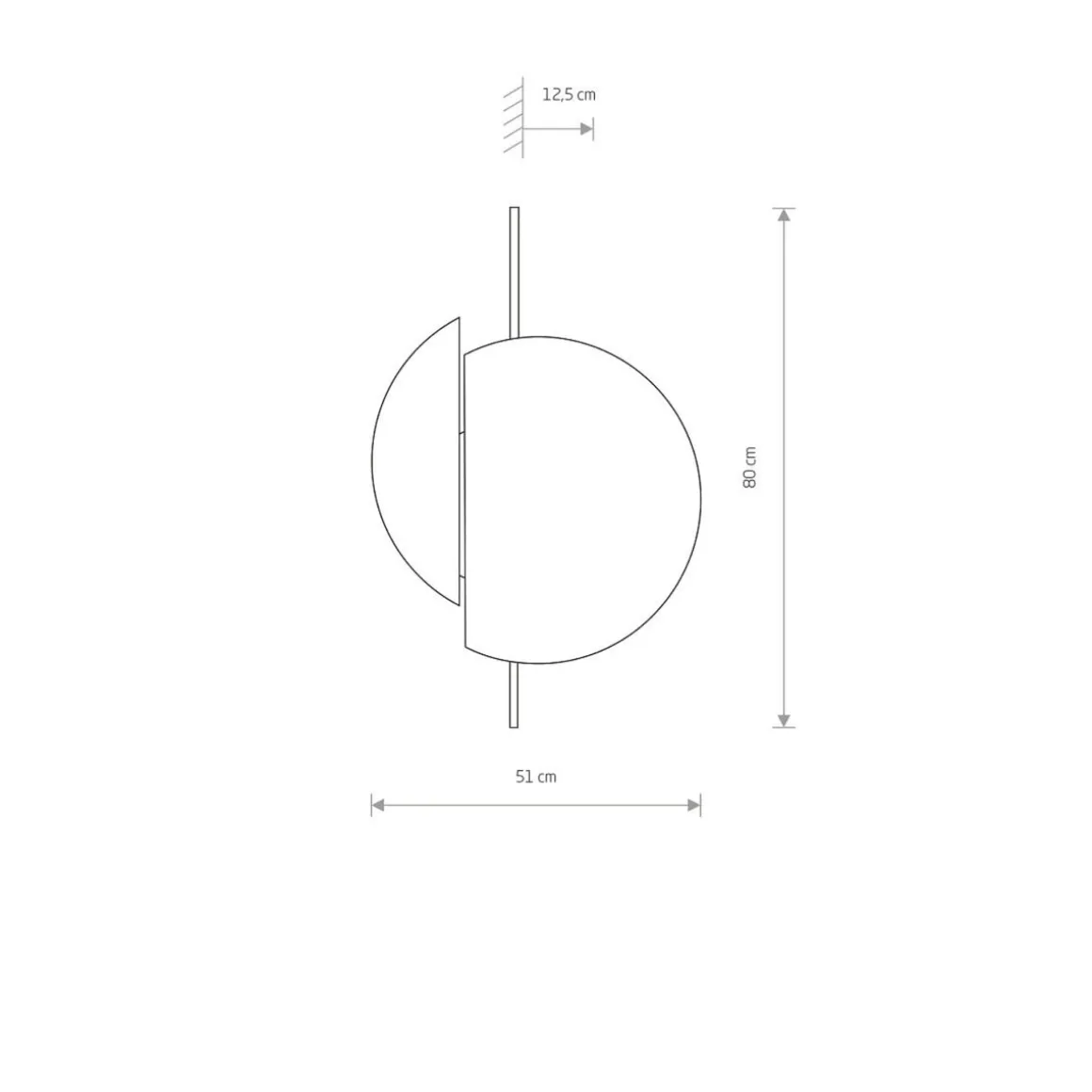 Sunset C Vegglampe består av en rund plate delt i to ulikt store deler utført i brunt treverk og plassert offset for hverandre