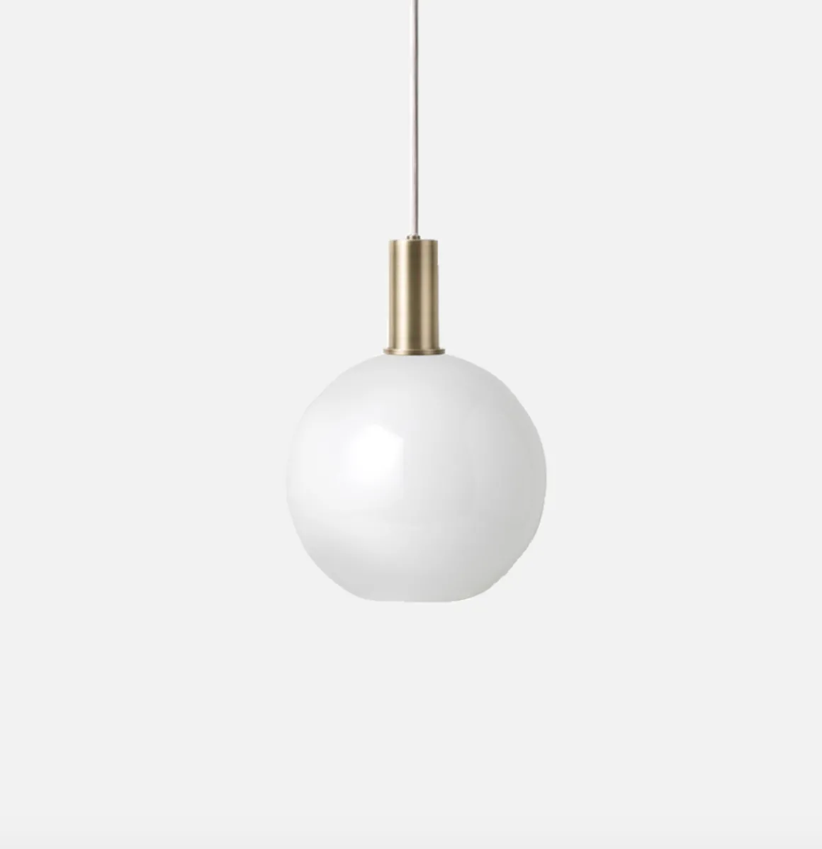 Enkel og pen taklampe fra Ferm Living. Opal glasskjerm og oppheng i messing. Her får du godt og jevt lys til rommet. Fin lampe å bruke i stue, soverom, gang eller over spisebordet.