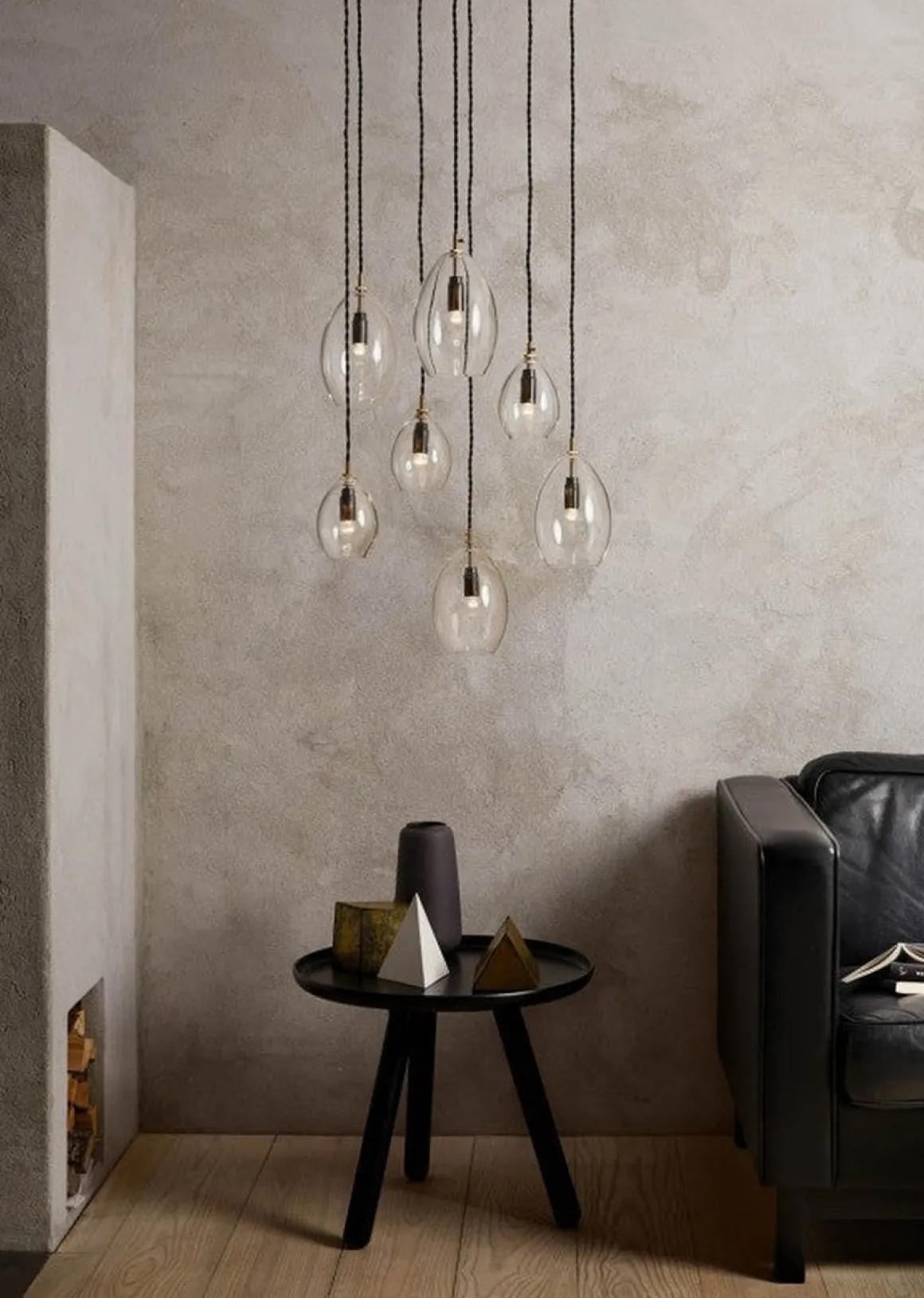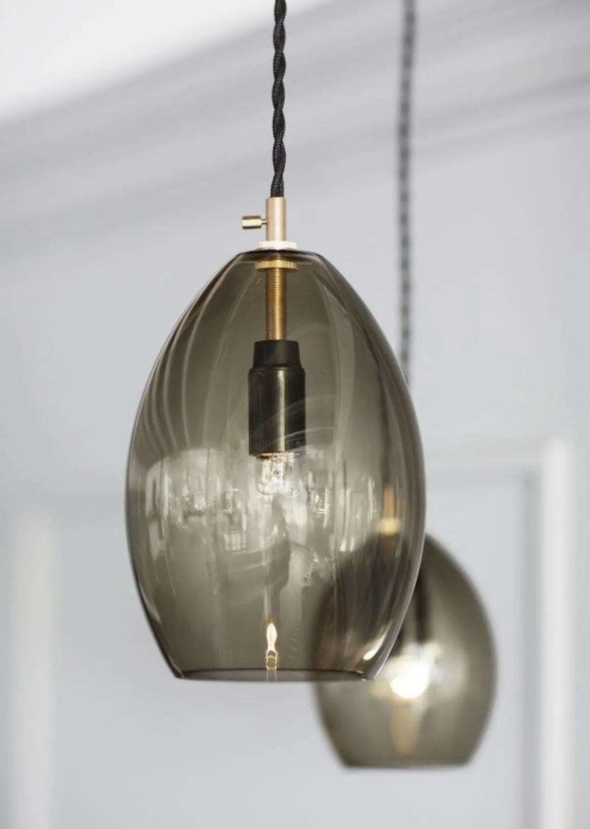 Unika pendlene ble designet i 2012 av designduoen Anne Louise Due de Fønss & Anders Lundqvist. Nydelig munnblåst glass, messingdetaljer og sort tekstilledning. Fin å bruke alene eller sammen med flere. Gir generell belysning.