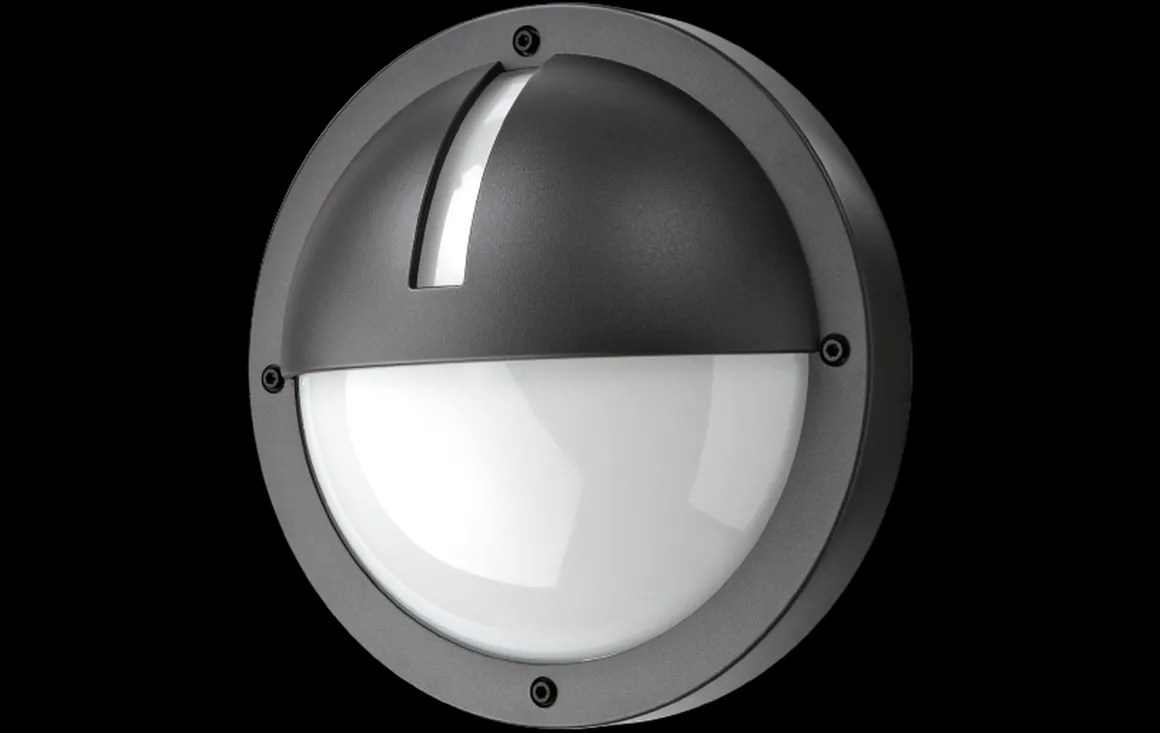 Flott, rund veggarmatur med halvskjerm og kryss som kan monteres både ute og inne. Utført i trykkstøpt, pulverlakkert aluminium. Skjerm i UV-stabilisert opalisert polykarbonat. To kabelinnganger og mulighet for både synlig og skjult kabling. Enkel montering med hurtigklemmer. Vandalsikker IP65/IK10.
