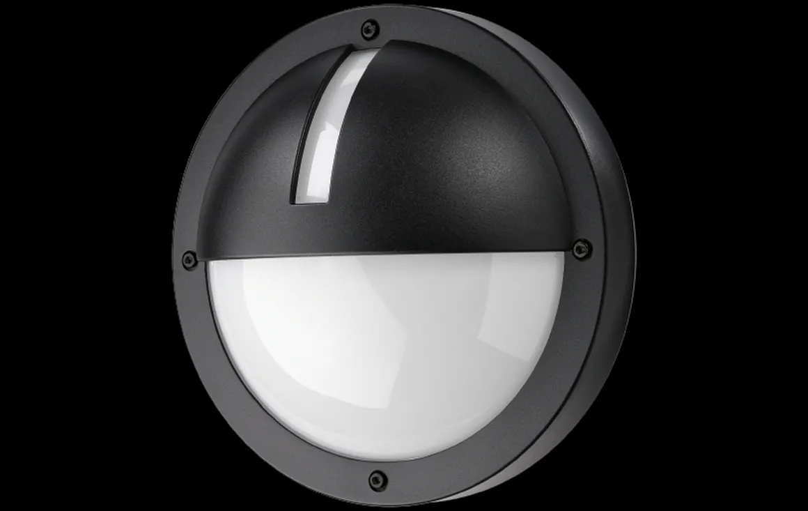Flott, rund veggarmatur med halvskjerm og kryss som kan monteres både ute og inne. Utført i trykkstøpt, pulverlakkert aluminium. Skjerm i UV-stabilisert opalisert polykarbonat. To kabelinnganger og mulighet for både synlig og skjult kabling. Enkel montering med hurtigklemmer Vandalsikker IP65/IK10.