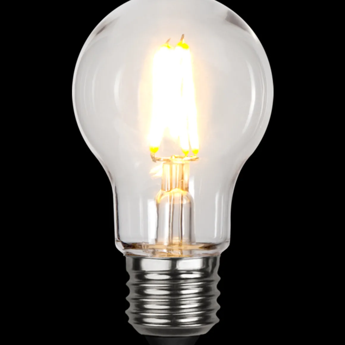 LED-lampen har et plastdeksel for bedre å tåle utendørsmiljøer. Den er godkjent for utendørs bruk. Fargetemperaturen er 2200K og sokkelen er E27.