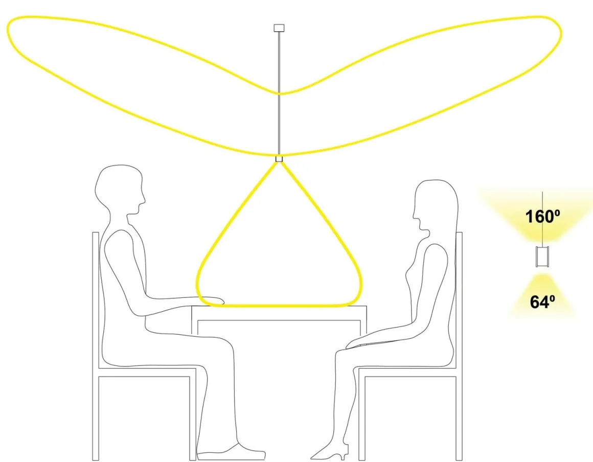 64⁰ med lys ned, og tilnærmet blendfritt lys. 160⁰ lys opp i taket for å gi romlys. Lysene kan reguleres individuelt (av, på, dimming) via sens-dim funksjonen.