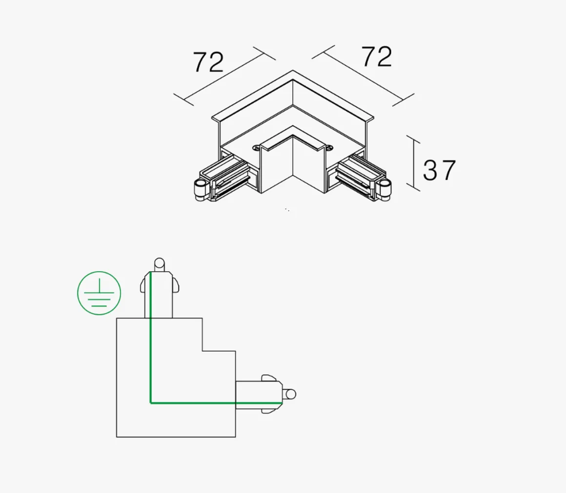 Vinkelskjøt med jordingskobling på utsiden av hjørnet.