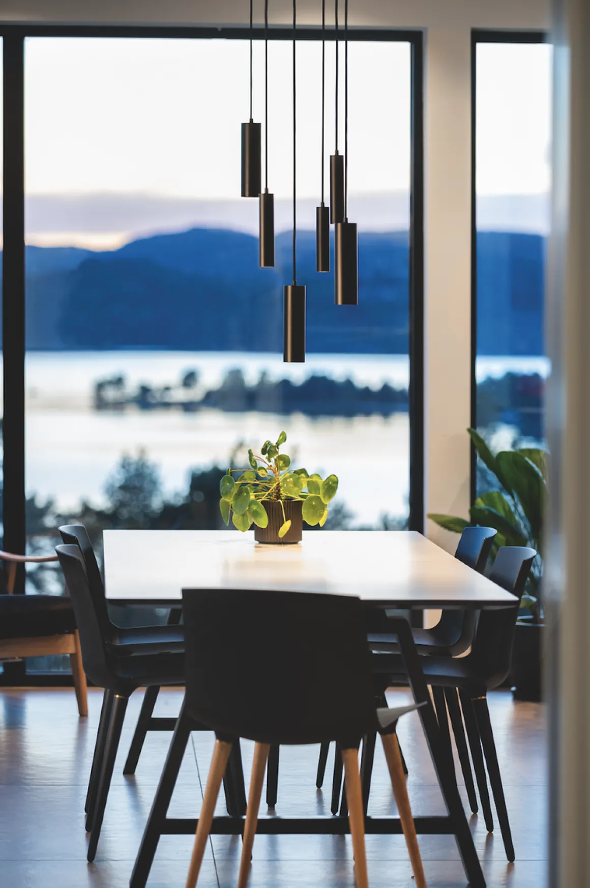 Minimalistisk, slank pendel for bruk i Zip-skinnesystem. Perfekt over kjøkkenbenk, spisebord eller i vinduet. Produsert i pulverlakkert, trykkstøpt aluminium og finnes i sort eller hvit finish. Den tilbaketrukne lyskilden gir minimal blending, og kan dimmes med ekstern dimmer.
